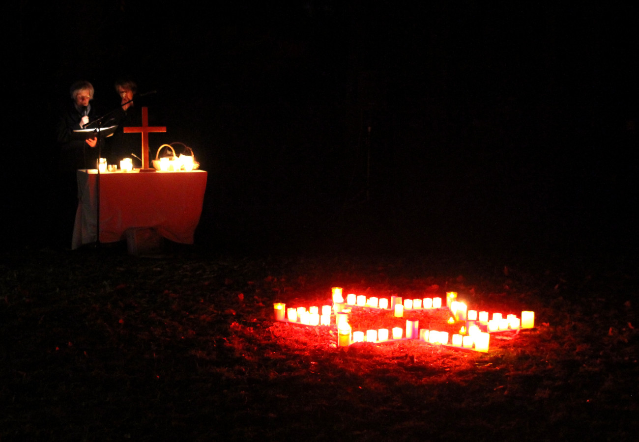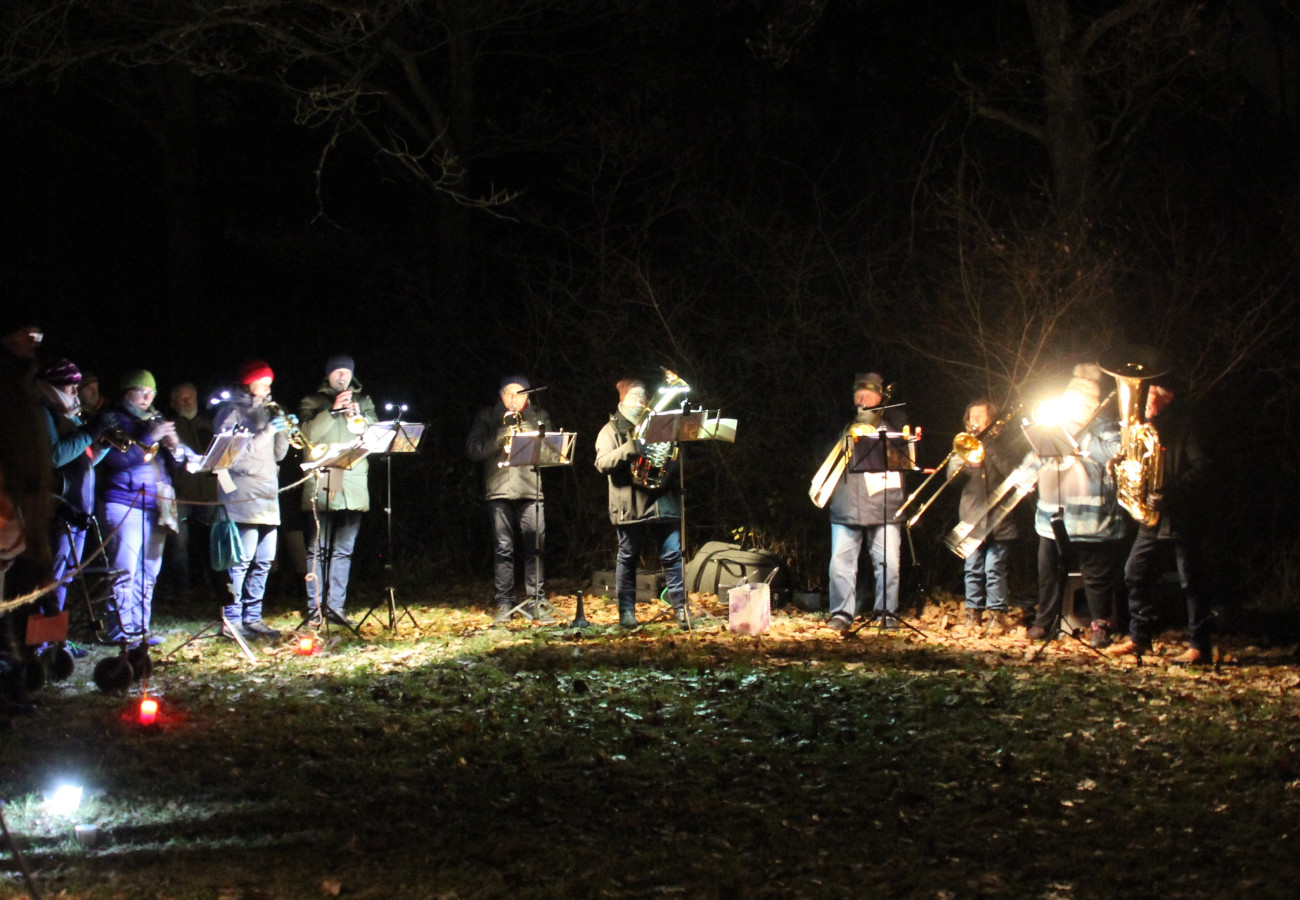 Kalt und sehr windig war es am Heiligenabend bei der Waldweihnacht in Höchstadt-Süd. Auch wenn die Kerzen, die entlang des Weges zum Gottesdienstplatz öfters vom Wind ausgeblasen wurden und auch die Kerzen vom Stern öfter neu angezündet werden mussten, so nahmen die zahlreichen Besucher bei der Waldweihnacht doch die zauberhaften Momente und die festliche Stimmung mit Bewunderung auf.