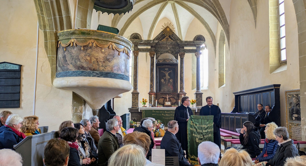 An Erntedank wurde auch das Gemeindefest gefeiert, und wir waren dabei, heuer in Kleinschelken, einer sehr aktiven und selbstbewussten Gemeinde Siebenbürgens. In der aufwändig renovierten Kirchenburg kamen viele Gemeindeglieder aus dem gesamten Kirchenkreis Mediasch zu Lob und (Ernte-)Dank zusammen. Chor und Orgel begleiteten den Gottesdienst lebendig und schön. Der Heimatverein Kleinschelkens präsentierte anschießend auf dem Marktplatz eindrucksvolle Folklore. Im Gemeindehaus wurde dann nach bekannt gutem Essen (aus der Mediascher Küche „Essen auf Rädern“) mit (Life-)Musik und Tanz weitergefeiert.